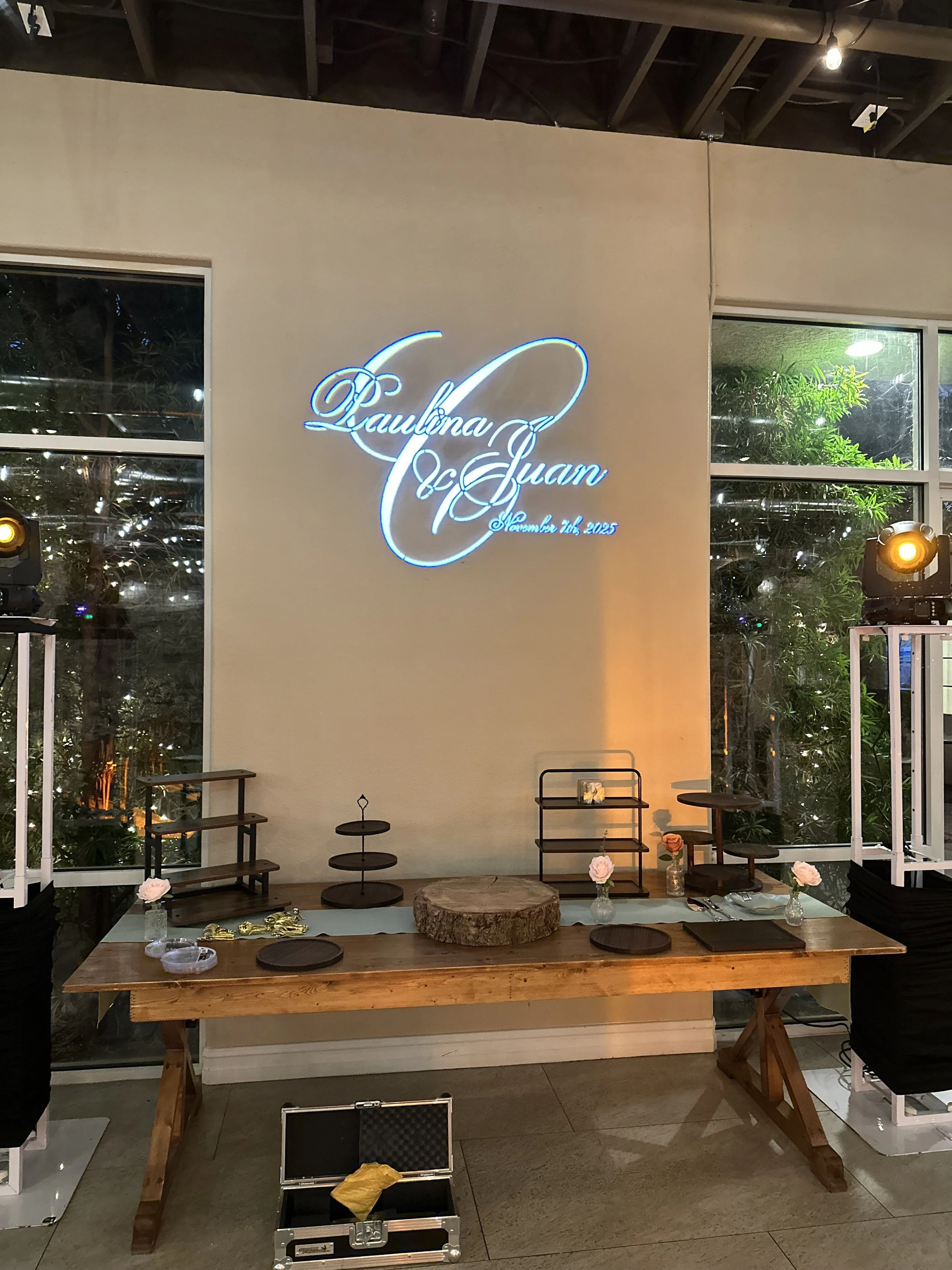 Your names or initials designed, ordered, and projected throughout the night. Two weeks notice required.